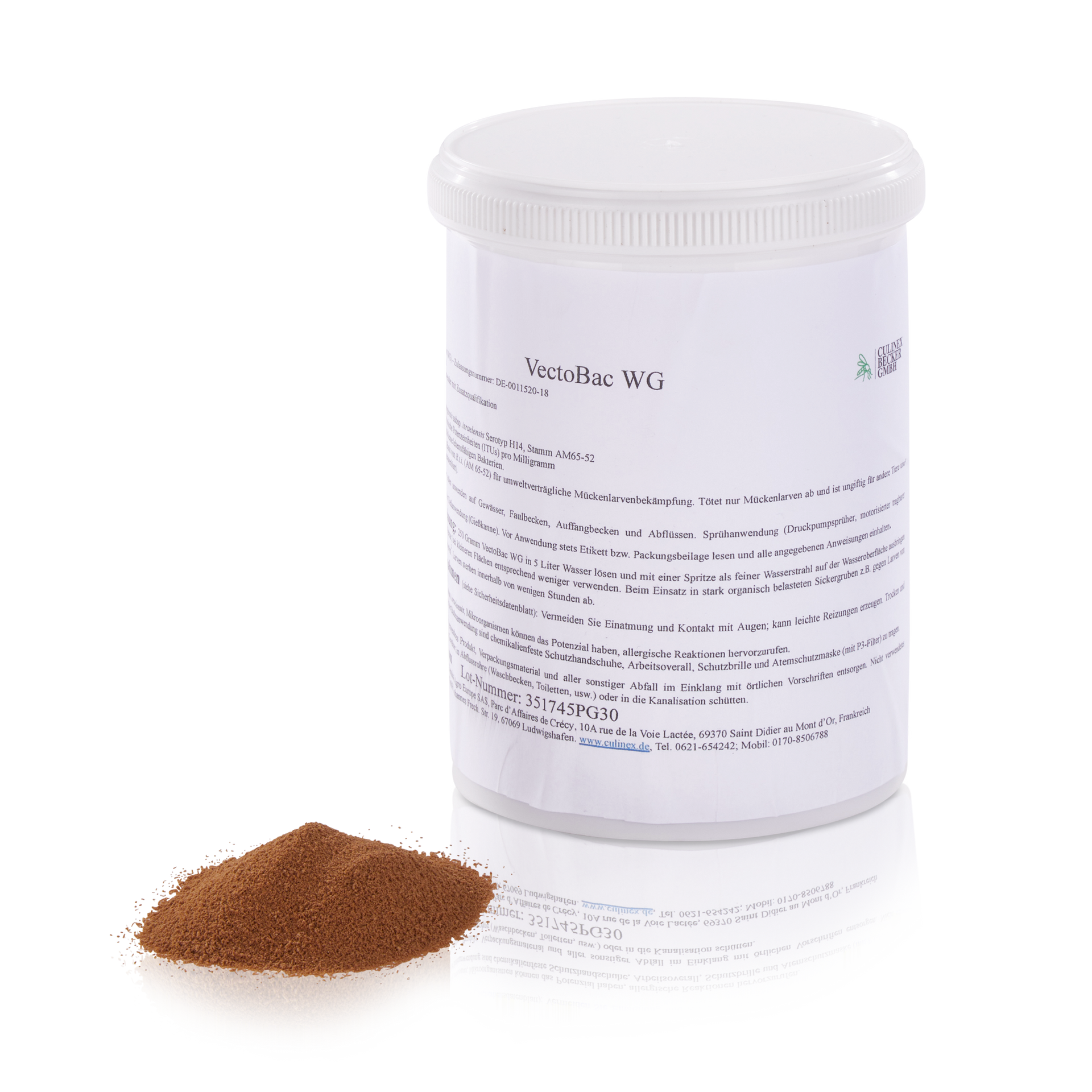 - A suspension of Bti powder (Vectobac WG) and pond water, with an average concentration of 500 g Bti powder in 10 l water, which is applied by "hand application" with a backpack sprayer to one hectare of water surface.