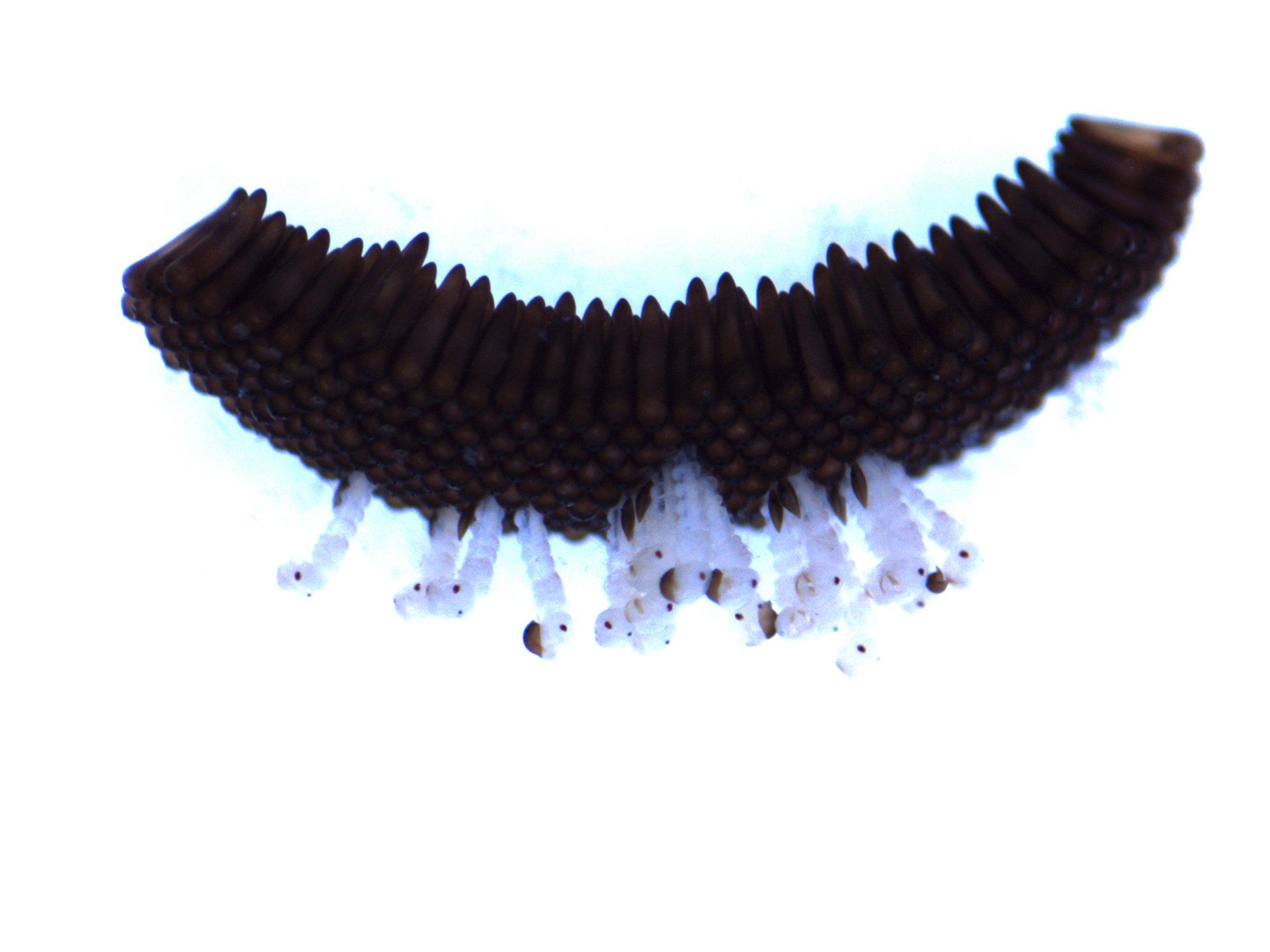The breathing tube of the larvae of the aquatic mosquito Coquillettidia richiardii differs greatly from the original shape because it has a special sawing device for drilling into plant tissue.